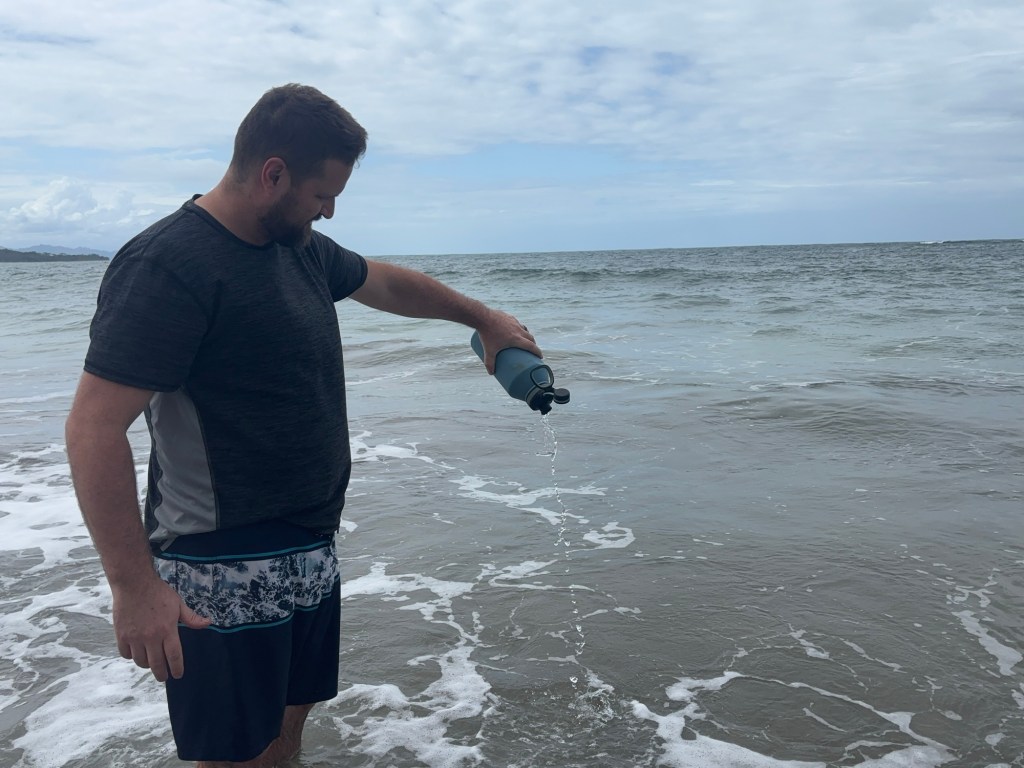 But then we took that drive back to our house and I brought half a gallon of the Pacific Ocean with me. And I kept it for 2 weeks. And then for my birthday we took a trip to the Caribbean side of the country to play for a couple of days (I also blogged some musing on my birthday) And I took that water bottle full of the Pacific Ocean to the Caribbean.